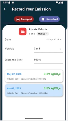 Once logged in, users can choose from two carbon footprint calculation methods—primarily focusing on the Actual Data Method, which involves detailed input from sectors such as transportation (private vehicles, public transport, and flights), household energy use, food consumption patterns, and other lifestyle-related expenses. Each input method allows users to provide data by usage, cost, or distance, making it flexible to different data availability.