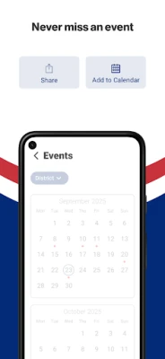 NEVER MISS AN EVENT The event section shows a list of events throughout the district. Users can add an event to their calendar and share the event with friends and family with one tap.