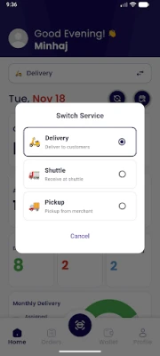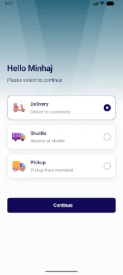 The app streamlines daily rider operations, covering Delivery to Customers, Pickup from Merchant, and Receive at Shuttle workflows.